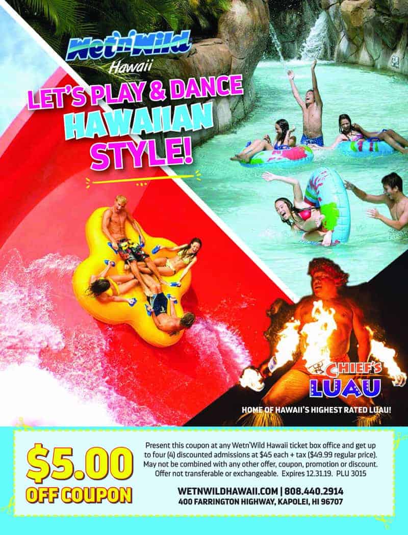Wet 'N' Wild Hawaii Coupons, Promo Codes July 2022 in Wet 'N' Wild Hawaii Coupons $15 off Sale Get $15 Off Regular Admission Fee Get $15 off routine admission charge Get Offer in Wet 'N' Wild Hawaii Coupons Offer Sale Cyber Monday Transaction! Basic Or Jr Entry Admission For $19.99 Each For Just One Day Have a Basic or Jr entry admission for $19.99 each for just one day.