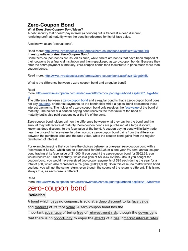 Zero-coupon bond - Wikipedia A zero coupon bond (also discount bond or deep discount bond) is a bond in which the face value is repaid at the time of maturity. [1] Unlike regular bonds, it does not make periodic interest payments or have so-called coupons, hence the term zero-coupon bond. When the bond reaches maturity, its investor receives its par (or face) value.