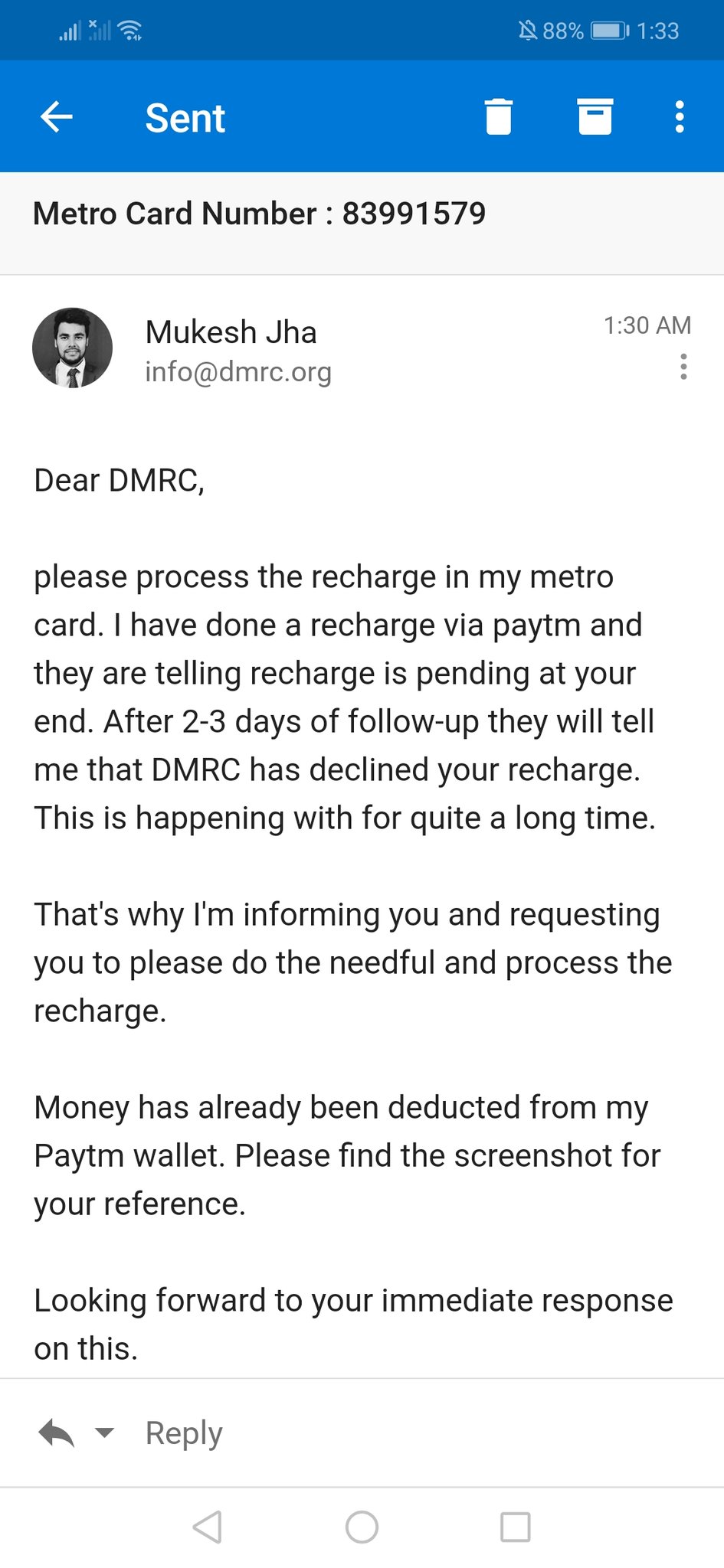 Welcome To Delhi Metro Rail Corporation The easy steps are 1. Enter the amount and card information. 2. Secure pay through Payment Modes (Debit Card/Credit Card/Net Banking/Wallet). 3. Go to AVMs installed at all DMRC Metro Stations (Including Airport Express Line) near EFO (Excess Fare Office)/Customer Care. ICICI account users can also recharge their cards with SMS facility.