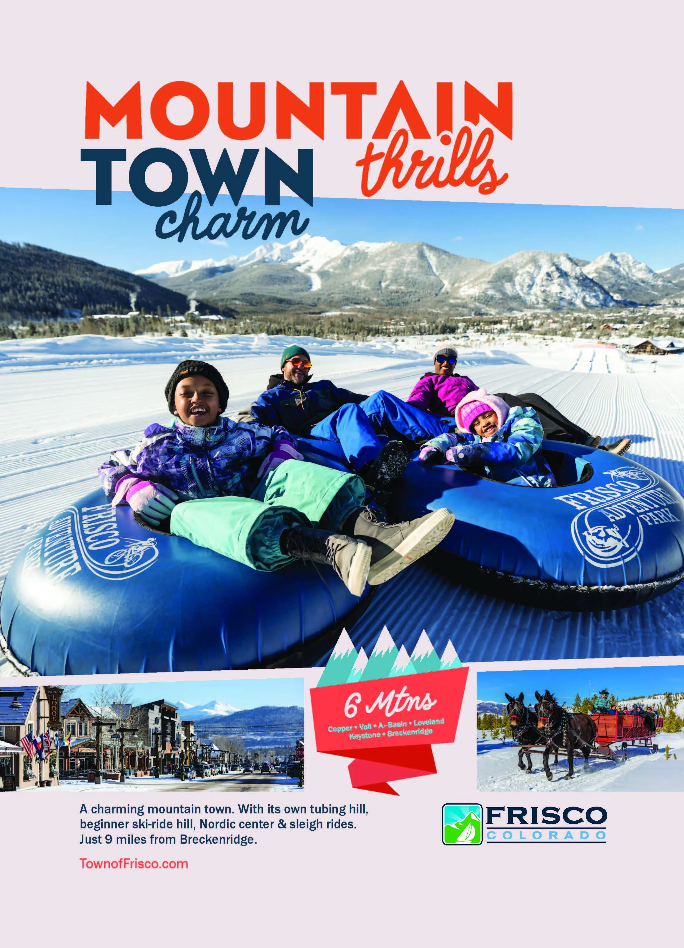 Frisco Adventure Park - All You Need to Know BEFORE You Go - Tripadvisor The Frisco Adventure Park is minutes from Frisco's charming Main Street, and in the winter, hosts a lift assisted tubing hill and a beginner ski/ride hill, 27k of cross-country ski trails, 8k of snowshoe trails, and horse drawn sleigh rides and dinners. Both the tubing hill and ski/ride hill require reservations, and ski and board lessons are ...